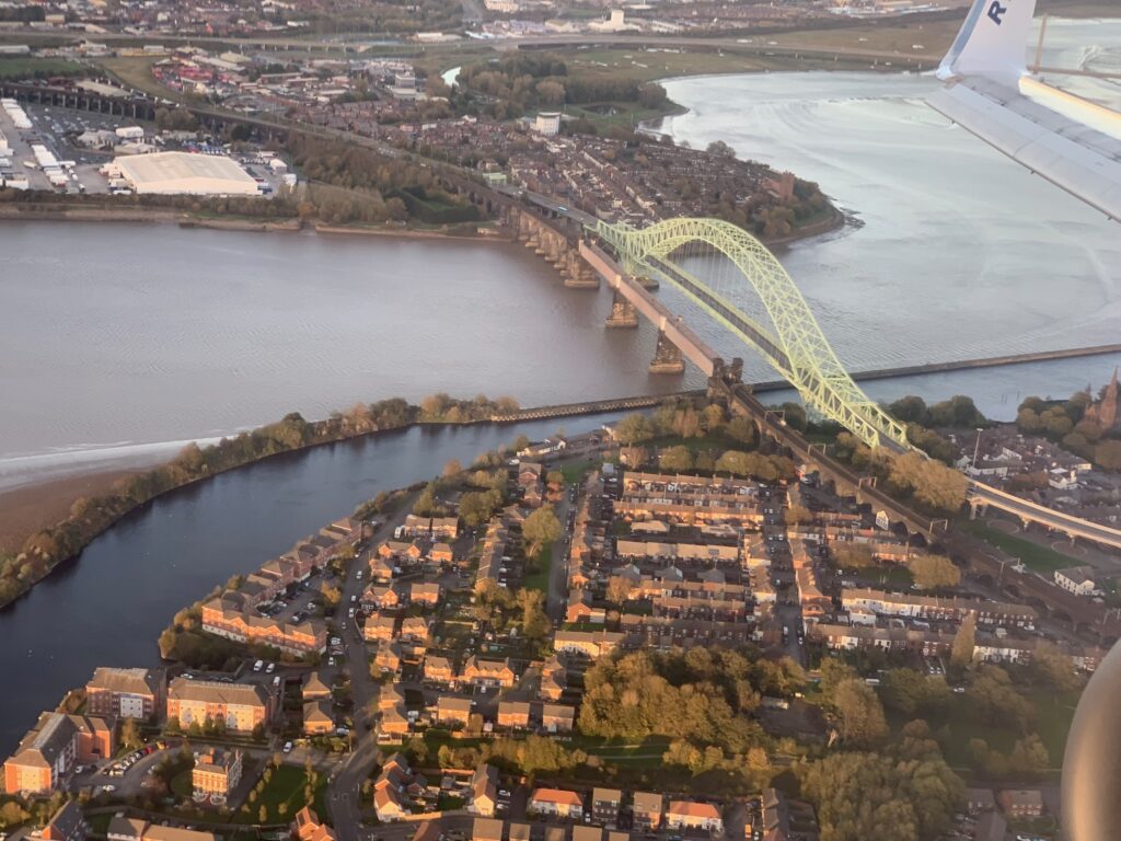 Flying back from Ireland I snatched this picture of the road and rail bridges at Runcorn/Widnes. This spans the river Mersey and Manchester Ship Canal.
