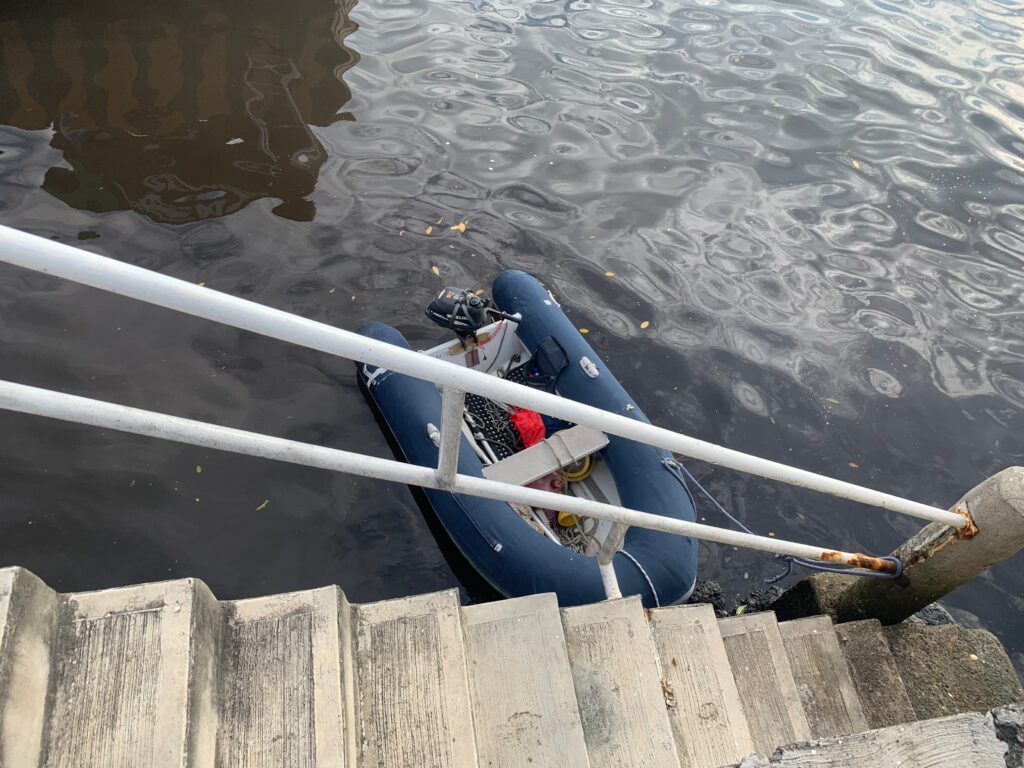 All went well, except the dinghy had deflated enough on the trip there and back that I decided I really must try to repair it while I had a dock to haul it onto.