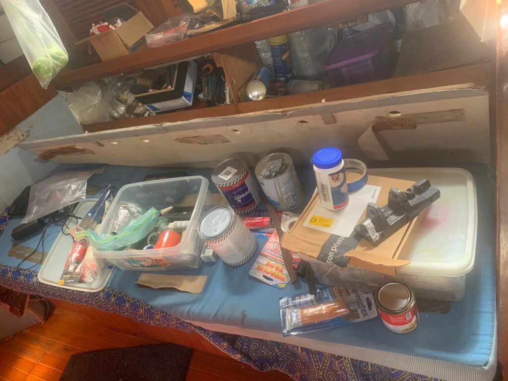 In looking for the glue, I reached deep into the starboard ‘glue/chemicals’ locker and found a few goodies I had completely forgotten about, like a roll of Sunbrella marine fabric. But mostly I found tubes and tubs of glue and sealers that are many many years old. One of today’s jobs will be throwing most of this away.