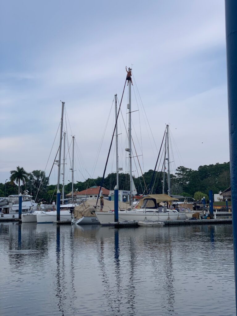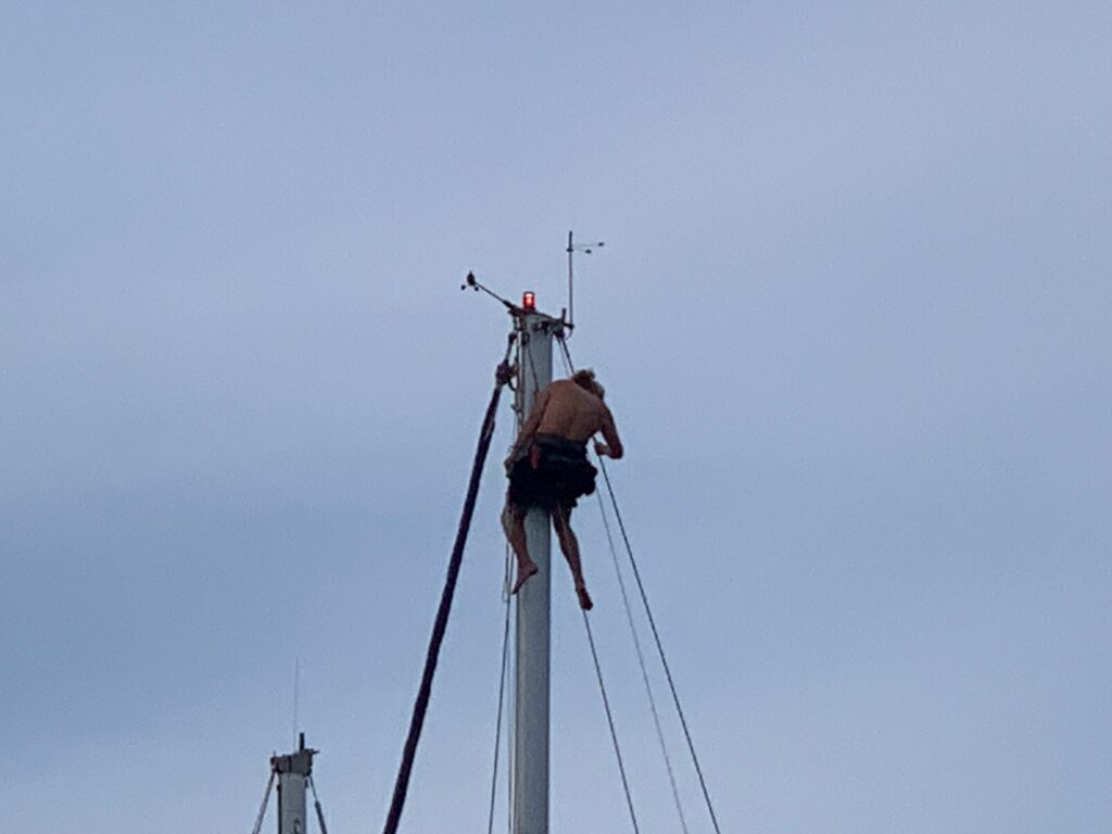 I heard noises from over the water and saw that Lee, a fellow Brit on a nice Moody 40-ish boat was checking his rigging. He is leaving the same time as me and heading to the same destination tomorrow, so should one of us get into dire straights, possible the other will be called on to help.