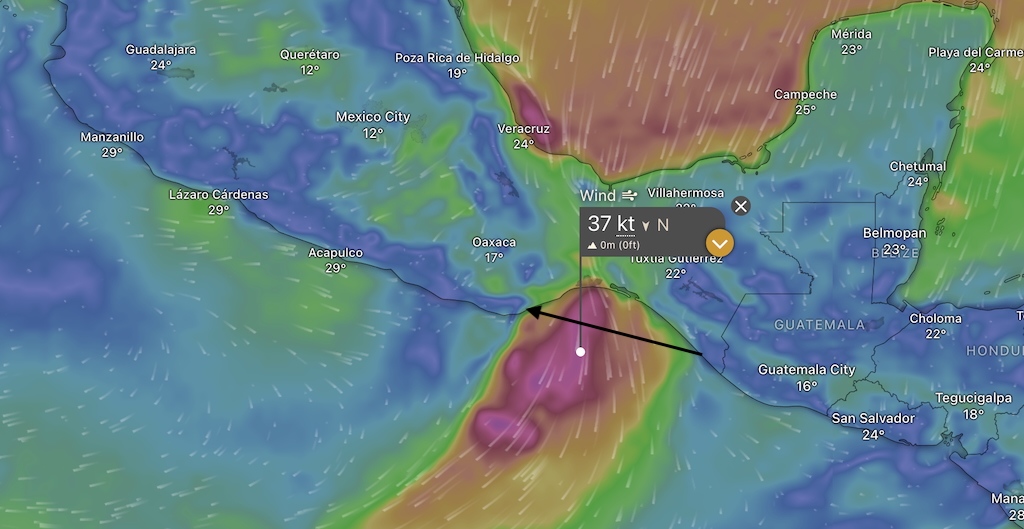 Most people here are planing to leave in about a week, currently we are at the start of a big blow in the Gulf of Tehuantepec, one has to cross this gulf to get north and it takes about 48 hours to do so. You can see how the wind, sometimes called a t-pecker, is currently funnelling through the gap in the Americas from the Caribbean to the Pacific. The gap in the land creates a venturi effect. For those not in the know, the venturi effect is an area of fluid dynamics studied once the ‘air lock’ effect has been mastered. 😉
