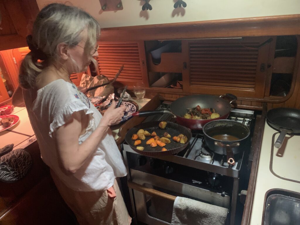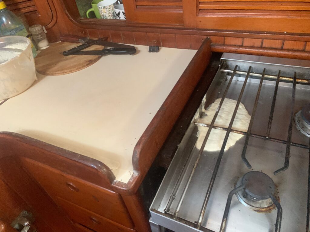 One of our biggest problems with this lifestyle is getting decent fresh bread. It’s not buch better in the USA either. People like sugar in their bread, I don’t get it. Despite having a French baker on our doorstep, or boarding ladder, we decided to try the Dutch oven as a way to easily make bread. I had consulted in advance with Tim, Galway’s head Baker, and had a plan. The Dutch oven is basically a very very heavy pot. I thought being a pot with a handle meant I could cook it on the stove, but the recipe called for the thing to go in the oven for a long time to get warm, then even longer to cook. None of this is great on a small boat in the tropics. However having spent more on this pot than any other kitchen item, I felt obliged to give it a go.