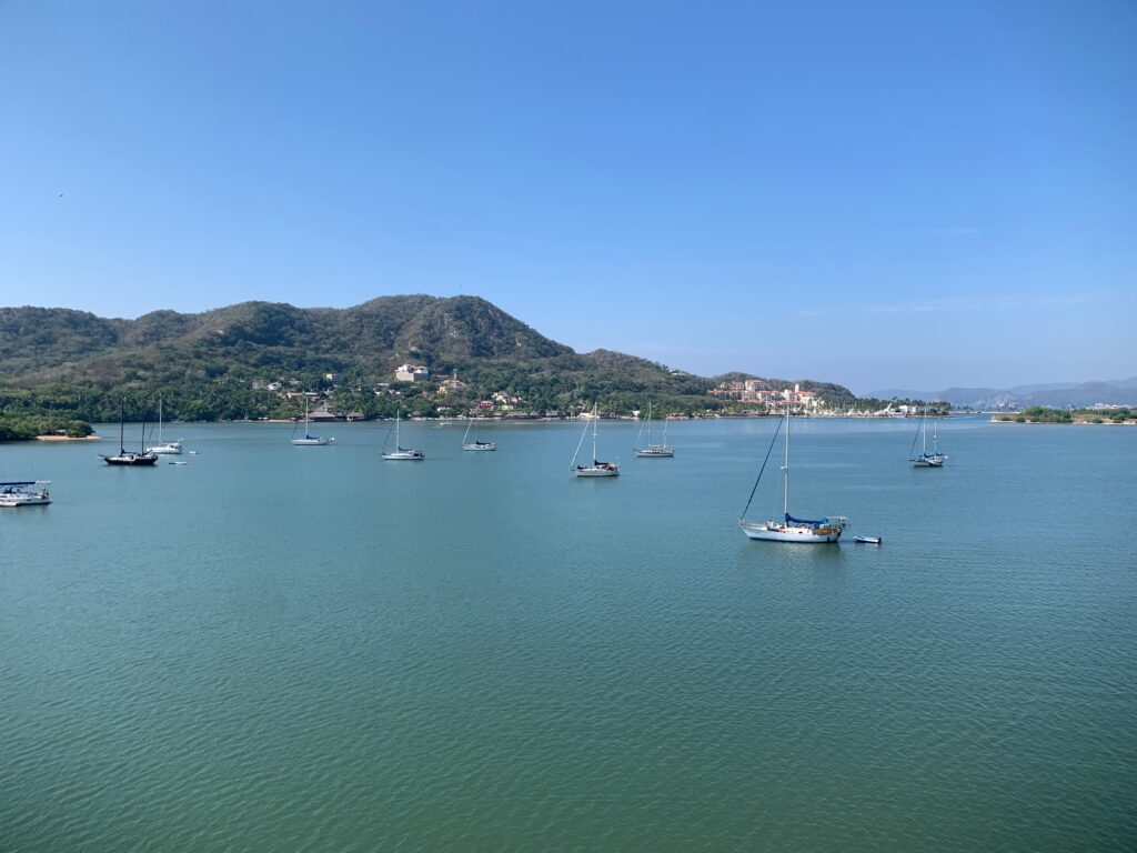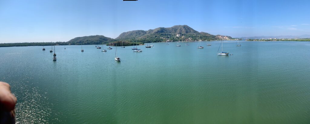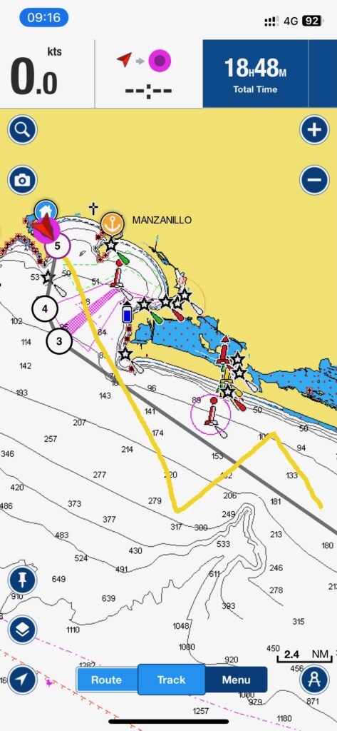 This bay has the large port of Manzanillo, it’s very busy and I am always conscious of crossing the shiping lanes. There is a traffic separation zone, to force big ships to arrive on the east and leave on the west. As a little boat, I’m meant to only cross this zone at right angles. We have the same setup around the top of the Island of Anglesey back home, this is mainly for the Liverpool Dublin/Belfast ferry and cargo traffic. I remember calling Holyhead Coastguard for permission to cross the separation zone on our trips to Ireland in Lady Stardust. I didnt bother calling the port captain this time, we were almost at 90 degrees and I don’t think he would have been interested anyway.