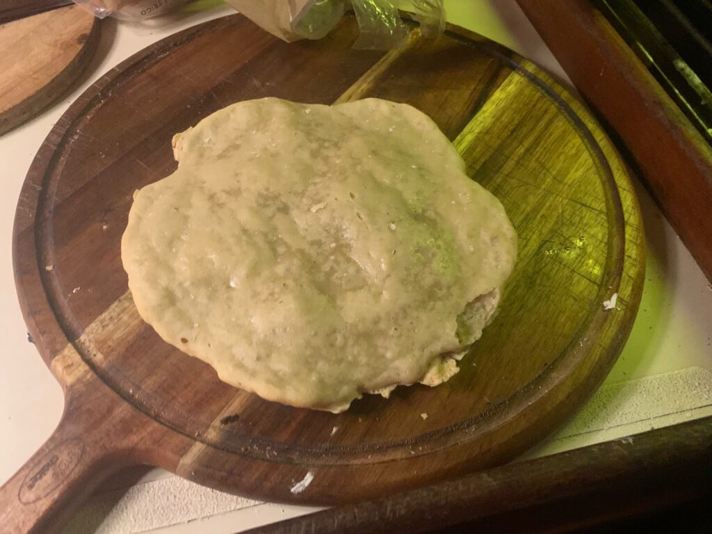 Kathy made the flour mix and spread it on a piece of plastic sheet, where we kneaded it. The plastic sheet was used so that we could lift it up and roll the dough into a pan. Of course the dough was too runny, and for some reason when I lifted the sheet, holding the four corners, it opened in the middle and the mix poured onto the stove top and down the side of the cooker.