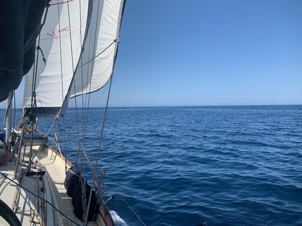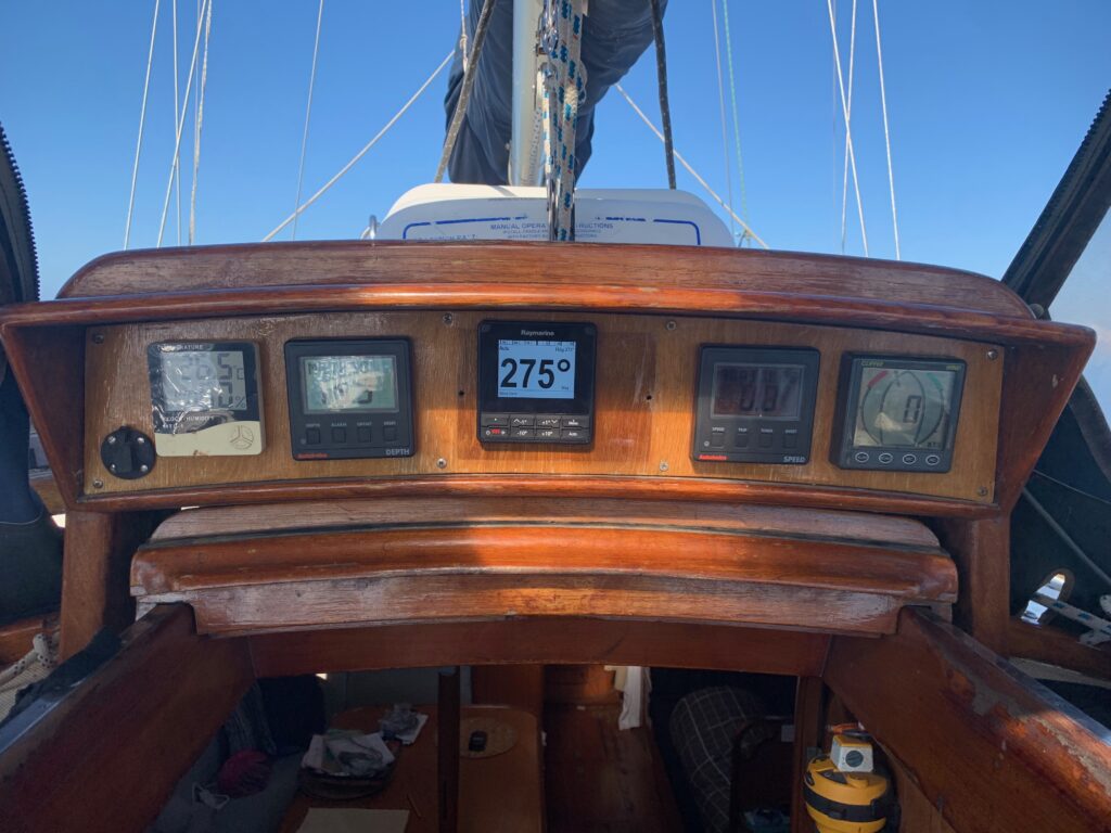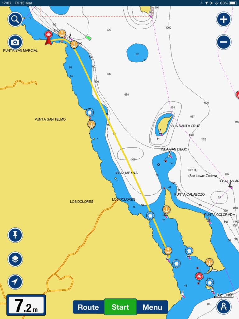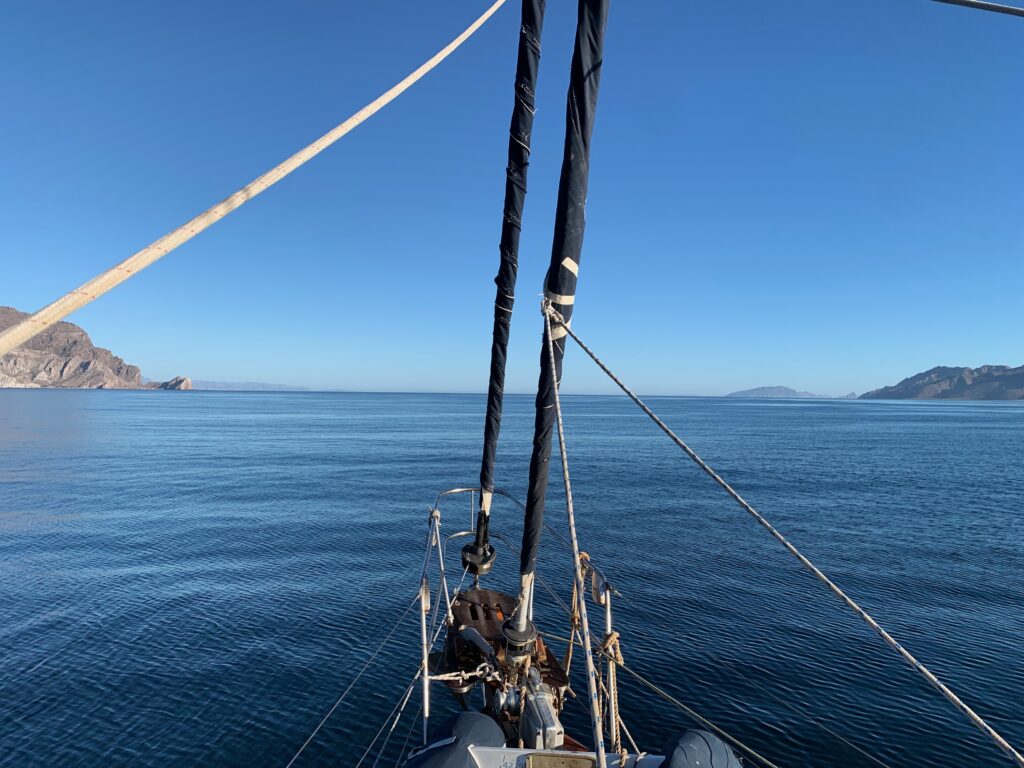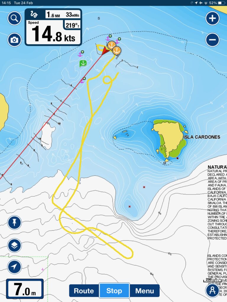 I have had some good wind so far, but this morning when it dropped , I couldnt start the engine, it seemed to not have any power from the battery. I wondered if I hadn’t fully returned the key position to ‘run’ and it was still powering the glow plugs, which would have flattened the battery, I wiggled and wiggled and then the engine fired up and we were away, so later I noticed the battery voltage was lower than I expected, so I again tried playing with the switch and I accidentally engaged the starter motor while the engine was running at 2000rpm. There was a bad noise and the engine slowed down, but I very quickly let go and everything seemed ok. My worry now is that I have damaged the starter motor. I won’t know until I try to start it again. So basically I am going to have to have the engine running until I reach land, and I won’t be stopping at the Island of Isla Espiritu Santa as planned, because that would be an awful place to be stuck with no engine. I’m going to have to travel a little further to get onto the mainland near La Paz. I chatted with Fosbot, my AI friend, and he basically told me that Volvo expect idiots like me to do this sort of thing and that they designed the start bendix system with this in mind, and I would be very unlucky to have a problem. I’m taking no risks.