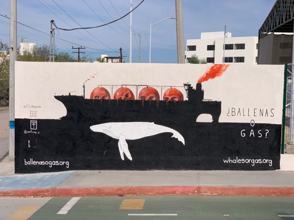 The mural above highlights concerns about plans to build a gas/oil terminal in the north of the Sea of Cortez, ‘The World’s Aquarium’, as Jacques Cousteau once called it.